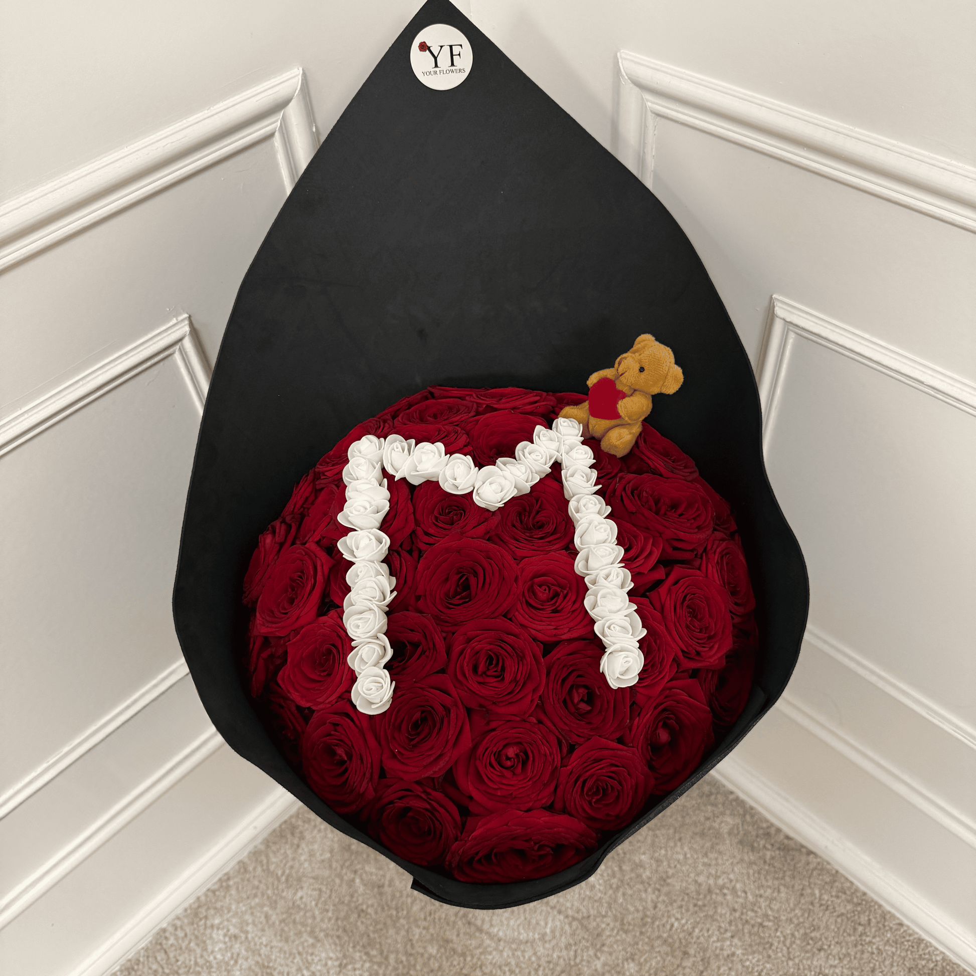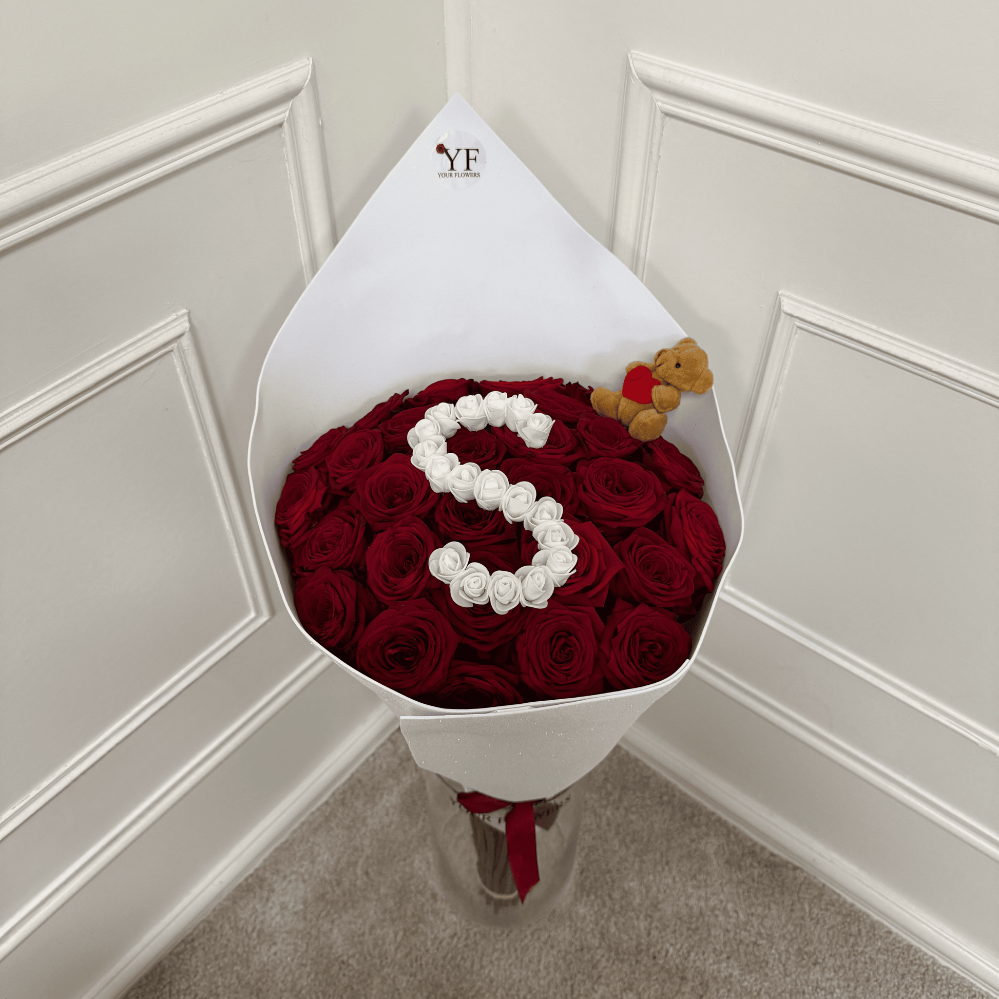 Un bouquet de roses rouges éclatantes, sublimé par un emballage pailleté élégant et une lettre initiale personnalisée.