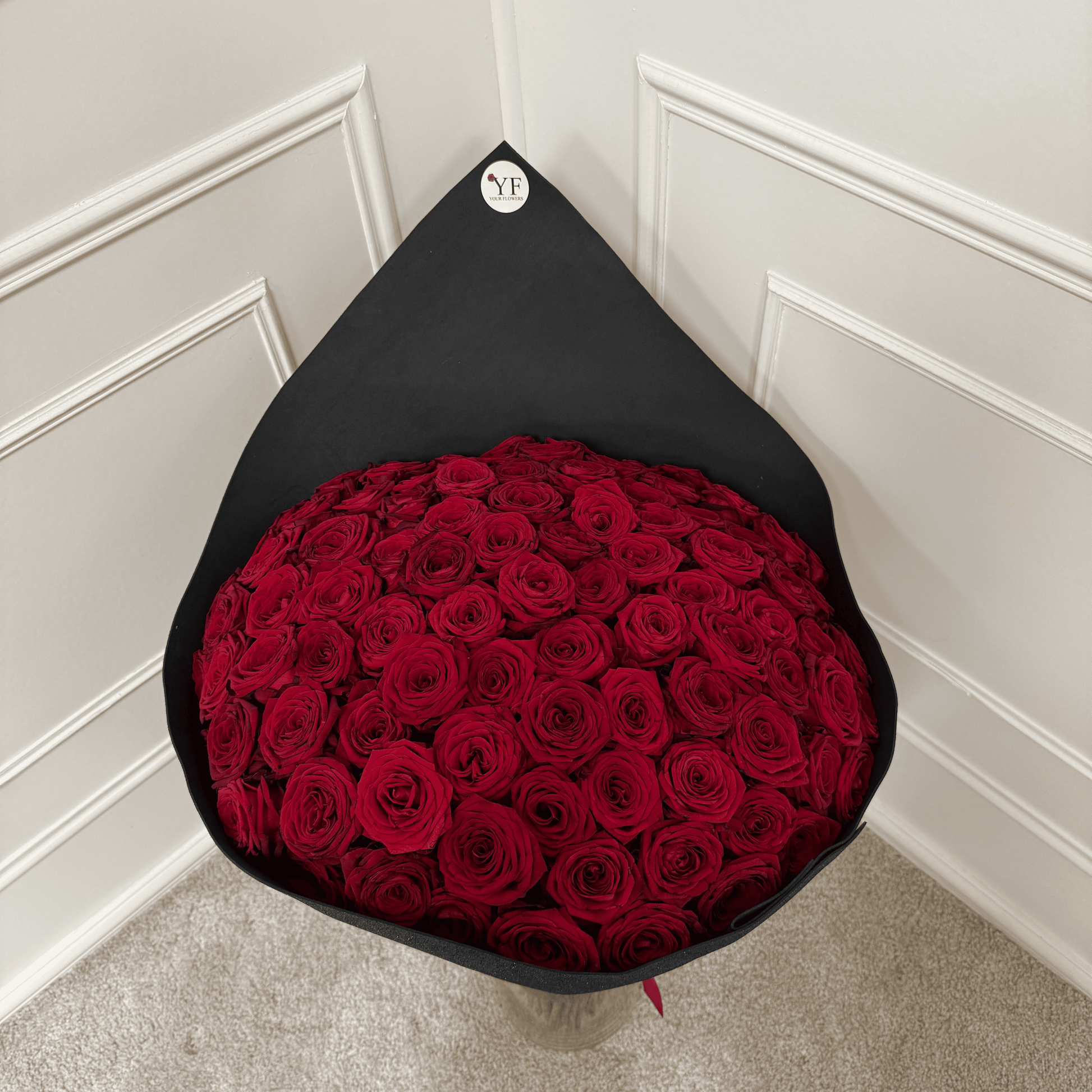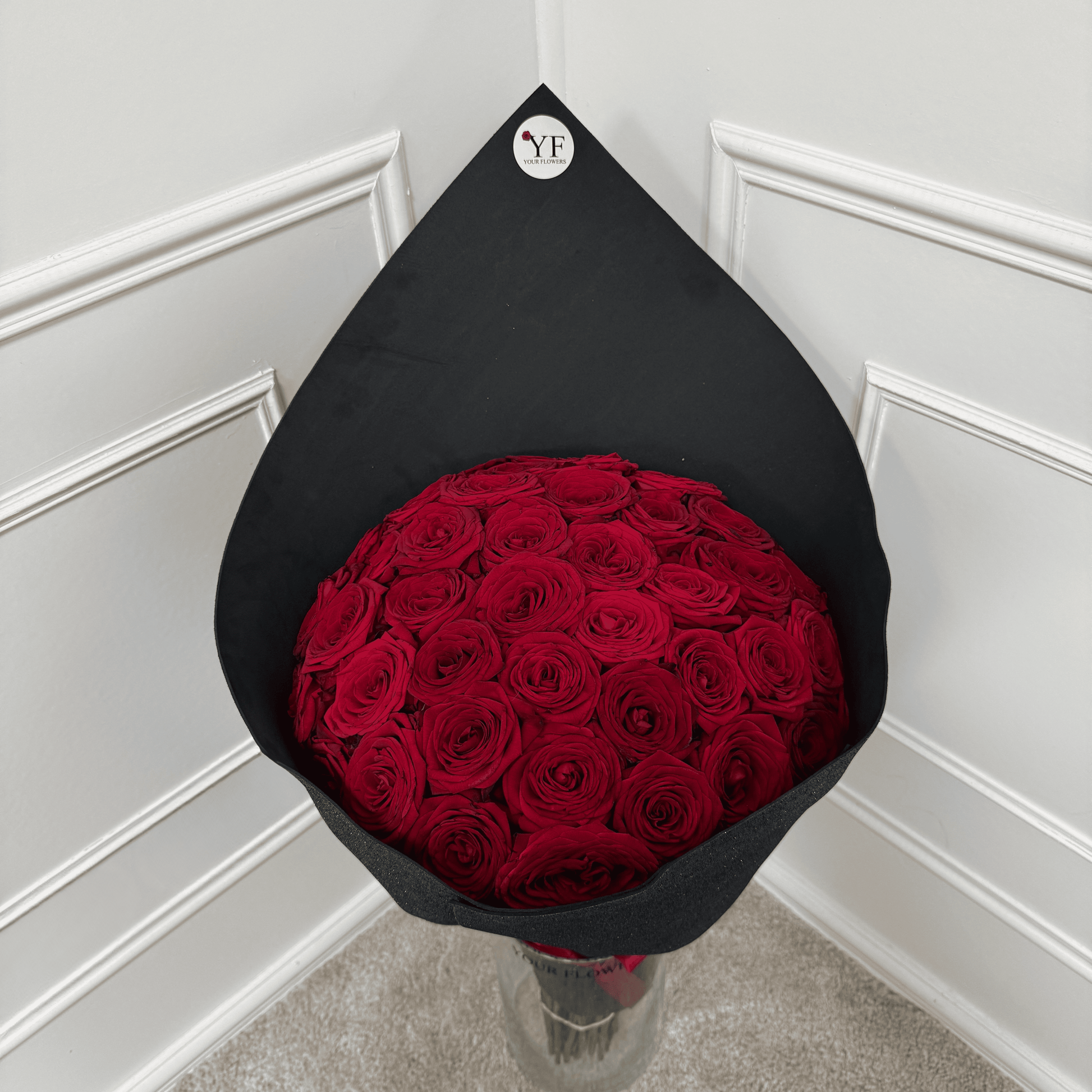 Créez un bouquet unique à votre image ! Choisissez le nombre de roses fraîches (de 10 à 100), l’emballage (pailleté ou classique), les couleurs de roses, ajoutez si vous le souhaitez une initiale, un chiffre ou encore un mot en fleurs.