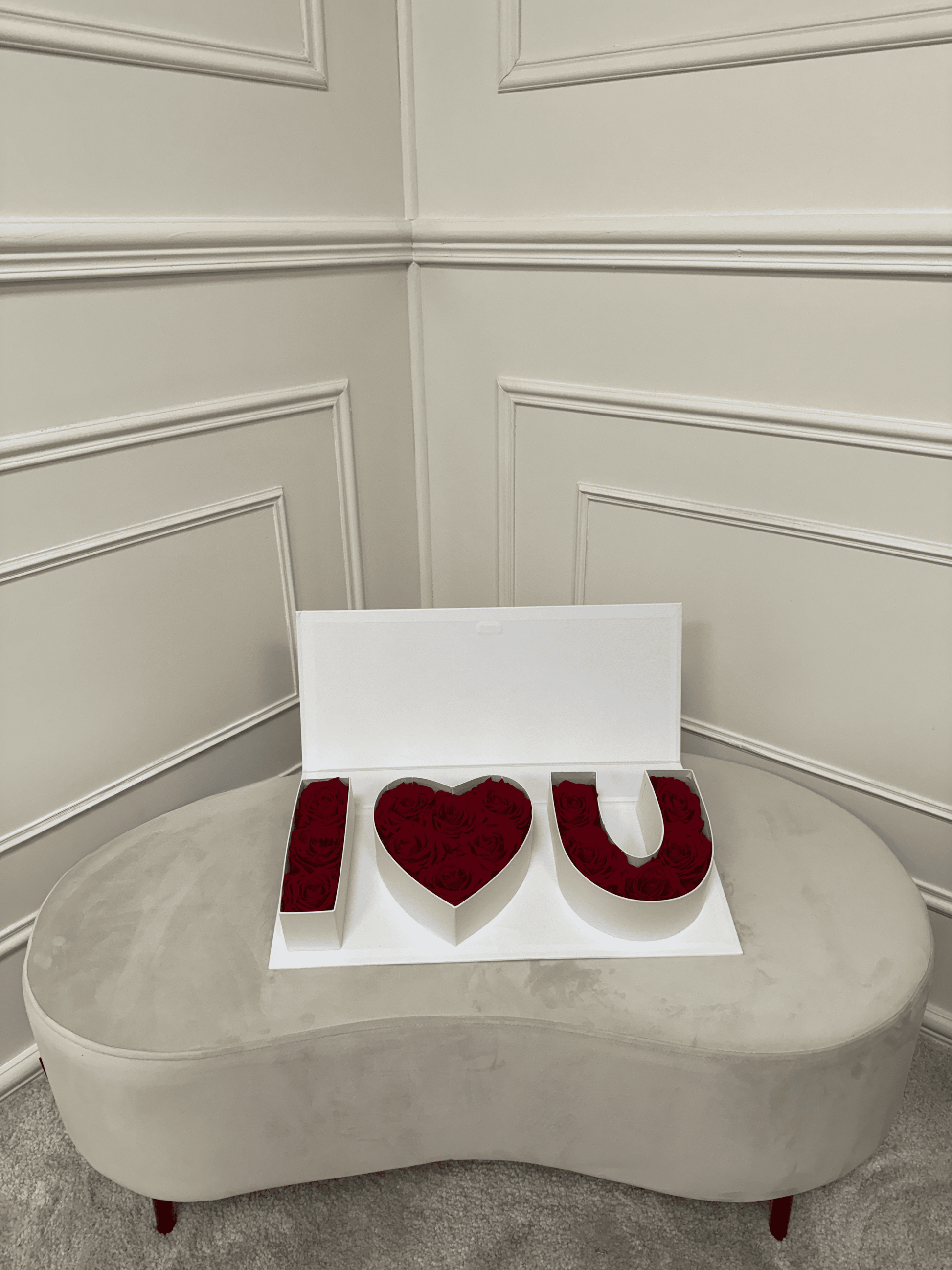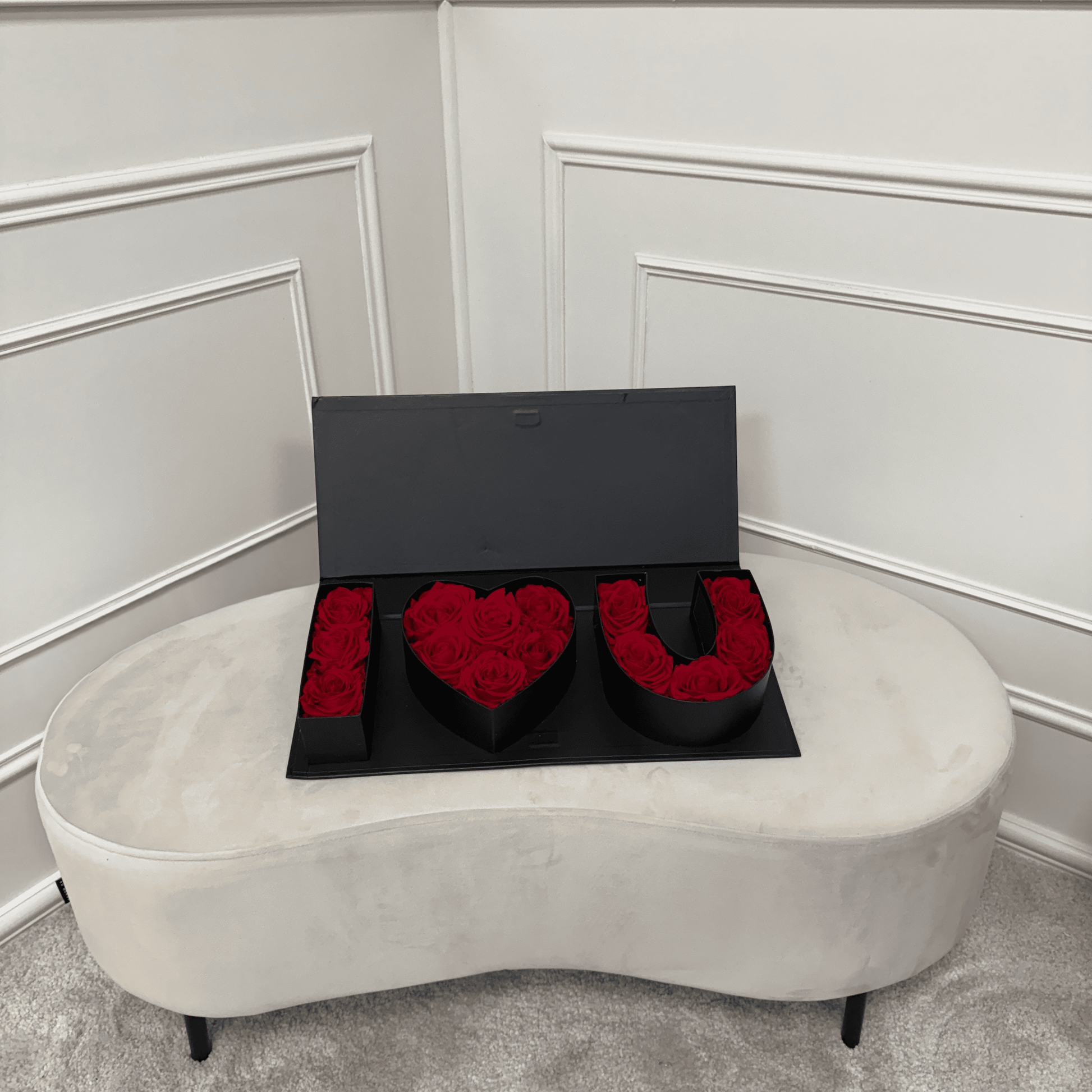 Déclarez votre amour avec élégance grâce à notre coffret "I LOVE YOU" composé de lettres en forme de I, cœur, et U, garnies de magnifiques roses éternelles rouges.