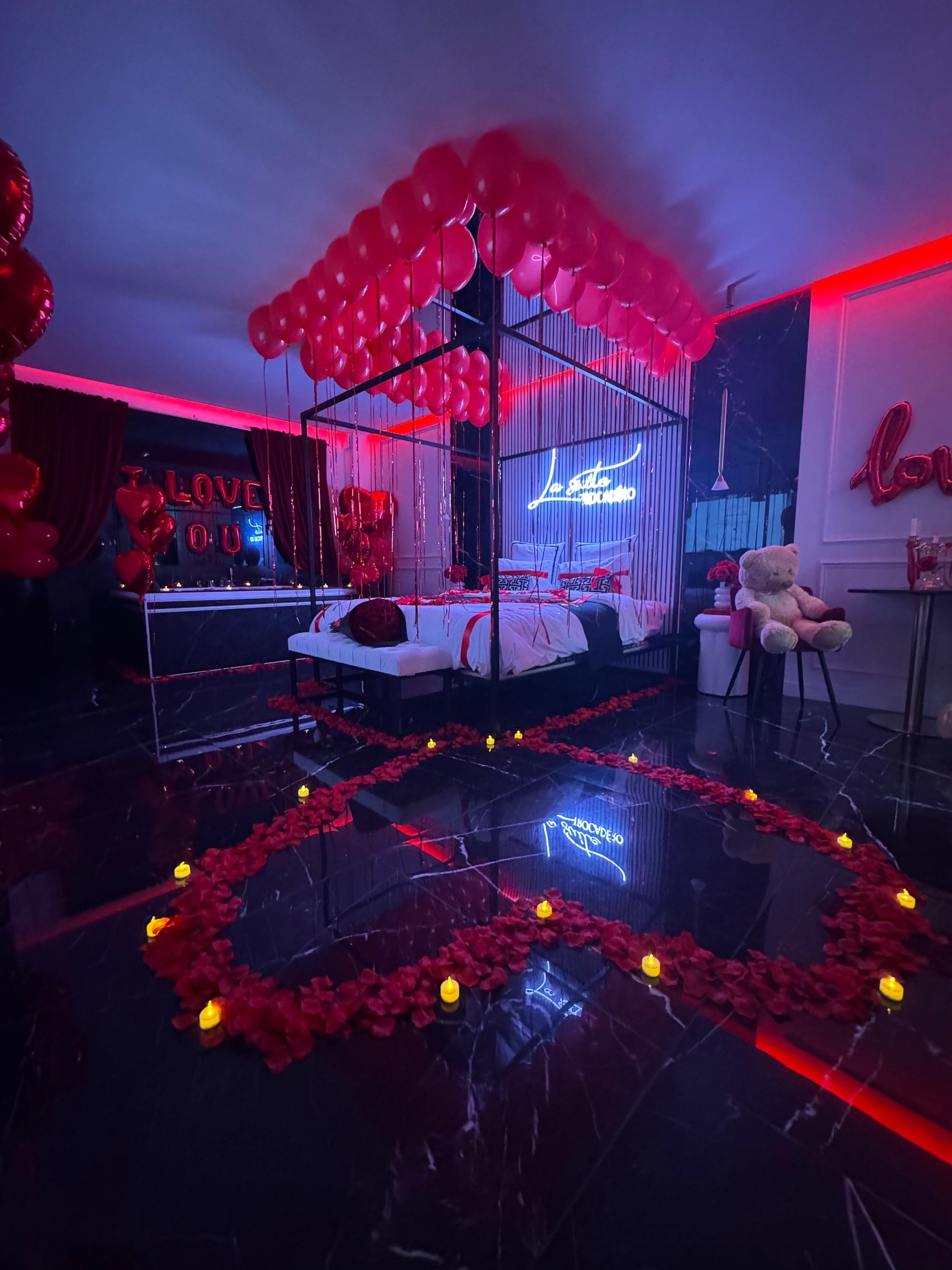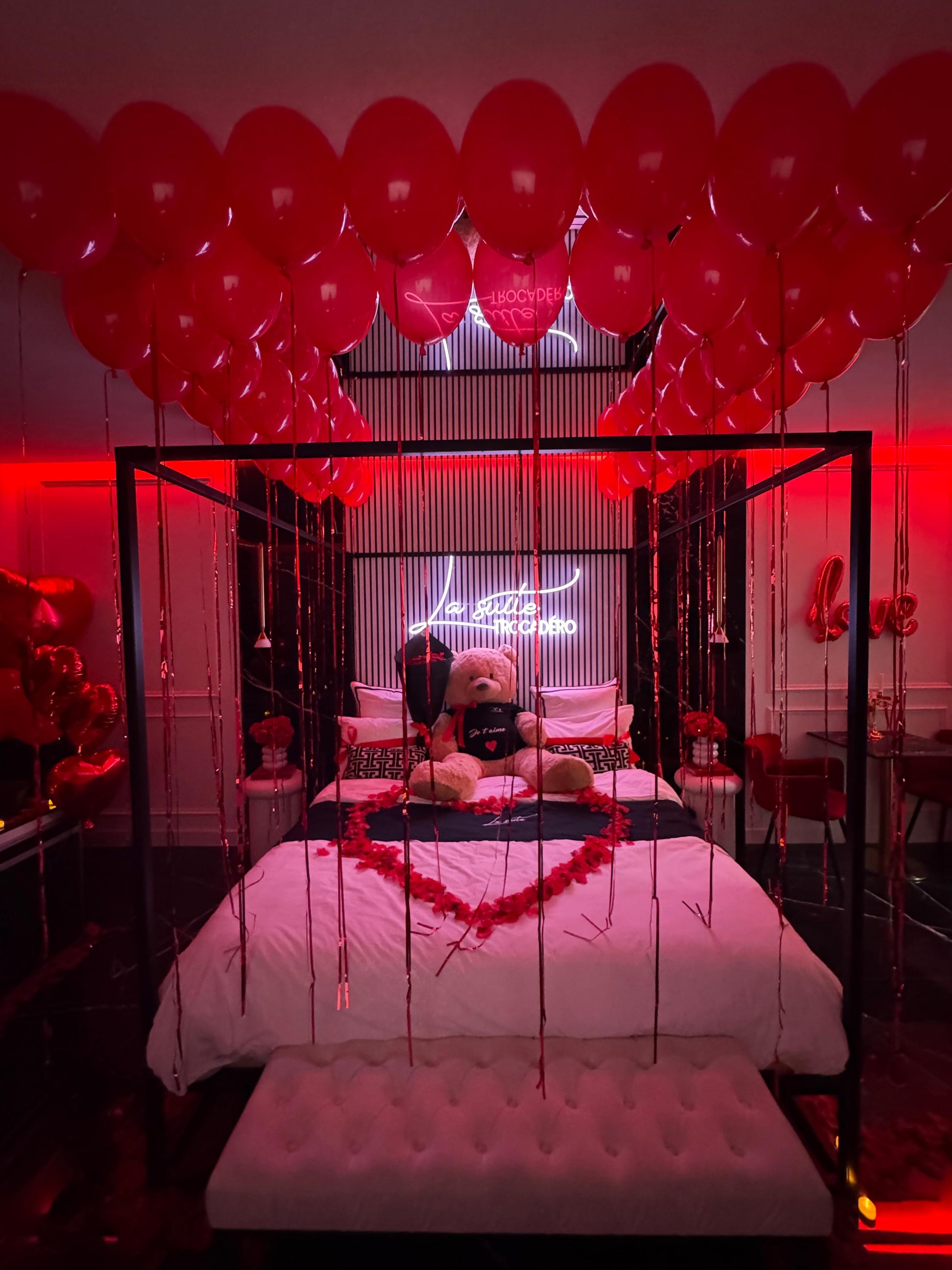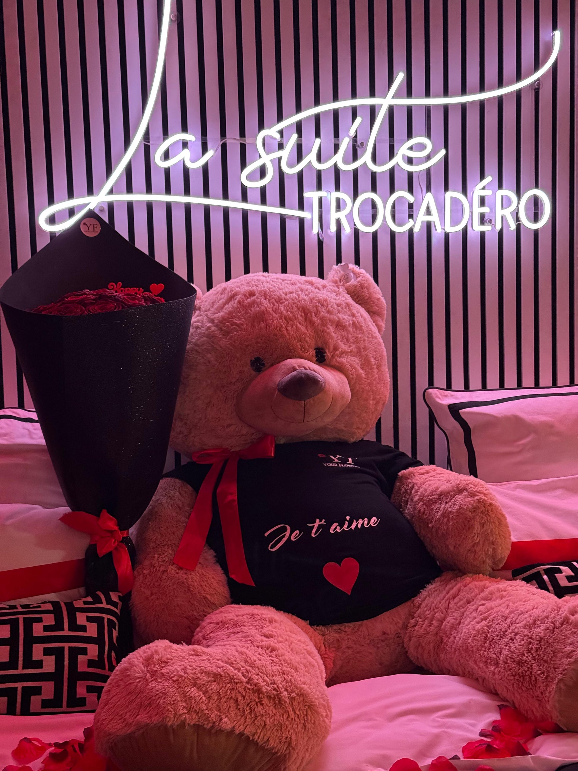 Le Pack Décoration - La Suite Trocadéro est l’expression parfaite du luxe et de la personnalisation. Il comprend un somptueux bouquet de 30 roses (emballage pailleté au choix), des lettres personnalisées pour un message unique, un grand nounours Charle XXL et un cake raffiné pour célébrer vos moments les plus précieux. Un ensemble idéal pour transformer vos instants en souvenirs inoubliables.