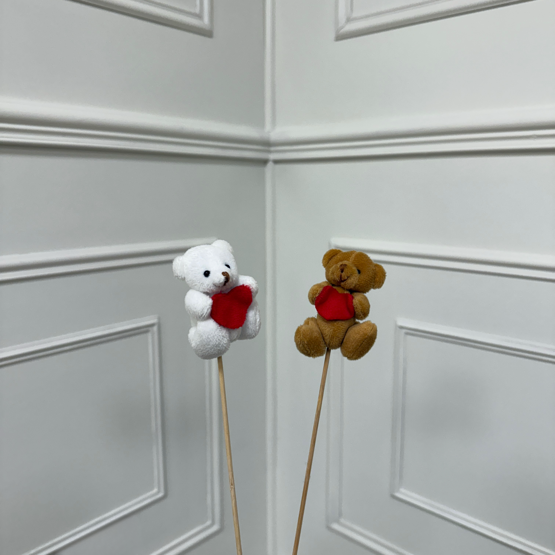 Disponibles en deux coloris (blanc et marron), ces petits ours en peluche tiennent un cœur rouge dans leurs bras et sont montés sur un pic en bois pour s’intégrer facilement dans toutes vos créations.